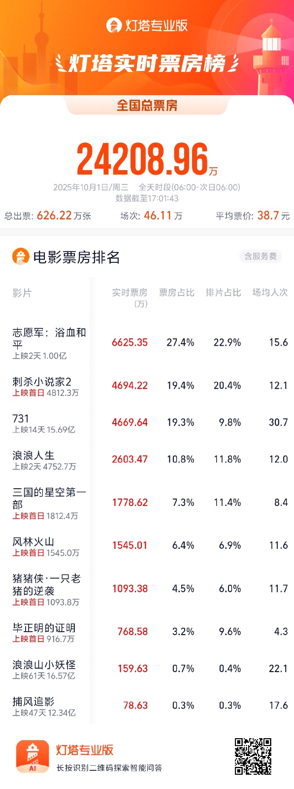 根据Lighthouse Professional Edition的数据,海报记者新闻QIN WEN报告说,截至10月1日下午5点,2025年全国假期的票房收入达到了2.42亿元。 “自愿军:血腥的和平”,“小说家2”,“ 731”,“栏杆中的生活”和“前三个王朝的星空天空”暂时属于当天的五个最佳现金办公室。 10月1日,灯塔数据分析师专业版Chen Jin在一次采访中说,“ 731”效果特别好,不仅位于票房的前三个,而且平均有30多个访客,而且超过了其他电影。这部电影在沉没市场上的重现非常好,票房收入为四个城市的35%。这在所有电影中尤其明显。如今,这部电影仍在许多州的票房继续,包括中国北部,西南和西北部。 Chen Jin说,今年的国庆电影有很广泛的VAR电影的iety涵盖了各种类型,例如历史战争(“志愿军”和“ 731”),幻想动作(“暗杀小说2”),喜剧家族(“ Wander Life”),动画(三个王国的第一颗星(第一颗王国的第一颗星)(猪人),“与去年相比,他们相比要增加了更多的人。 “自愿军”和“ 731”相对较高,这使得“暗杀小说家2”的特殊效果场景变得更加明显。 38.7元,去年同期41元低于41元,看电影的门槛降低了更多。