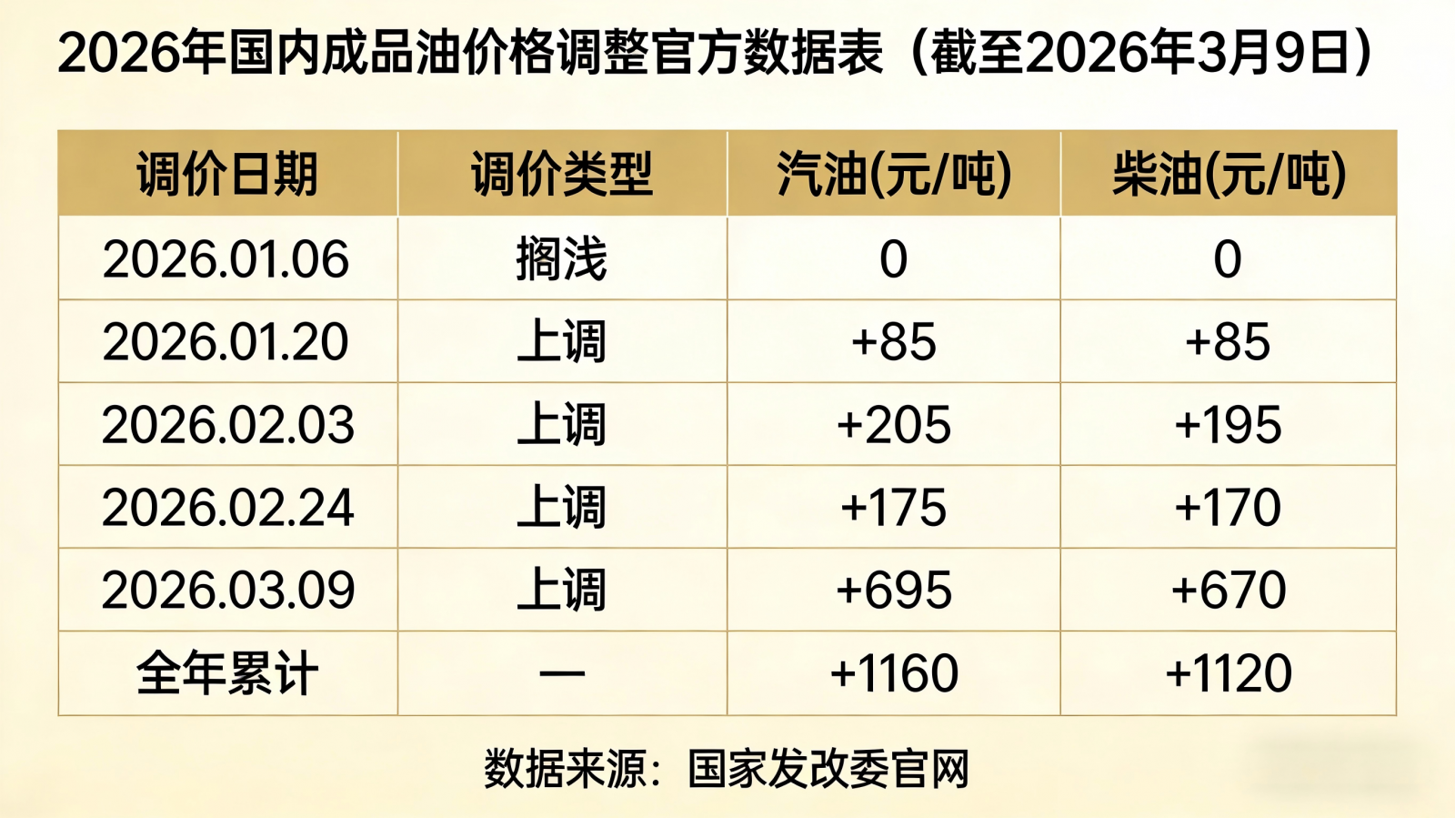 图像由人工智能生成,数据由国家发展和改革委员会提供。海报新闻首席记者陈家伟对此进行了报道。海报新闻记者今天从国家发改委获悉,近期国际市场原油价格出现波动上涨。国内成品油调价窗口于3月9日24:00开启,3月9日24:00起,国产汽油、柴油(标准品,下同)价格每吨分别上涨695元和670元。 92#汽油、95#汽油、0#柴油价格分别上涨0.55元、0.58元、0.57元。此次涨价是2022年3月17日24:00以来的最大涨幅,同时成品油零售价也标志着年内“四连涨”。据卓楚资讯测算,本次增持后成品油零售价完成后,私家车加满一箱50升92号汽油将贵27.5元。对于私家车,如月行驶里程2000公里、平均百公里油耗8升的汽油车,在下一个调价窗口开启(2026年3月23日午夜)之前,每辆车的燃油成本将增加约41元。在物流行业,如果以一辆每月行驶1万公里、每百公里耗油38升的大卡车为例,在下一个调价窗口开启前,每辆卡车的燃油成本将增加约1011元,这将增加重型燃油成本和运输物流保障的燃油成本。据新华社报道,由于地缘政治冲突,中东地区原油运输仍受阻,伊拉克、卡塔尔等主要产油国此前已宣布减产。分析多家机构STS认为,尽管地缘政治因素造成干扰,但短期内油价仍可维持强势走势。 3月9日,国际原油价格从低点大幅上涨,直线触及100美元以上。这是自2022年俄乌冲突以来油价首次突破这一水平。