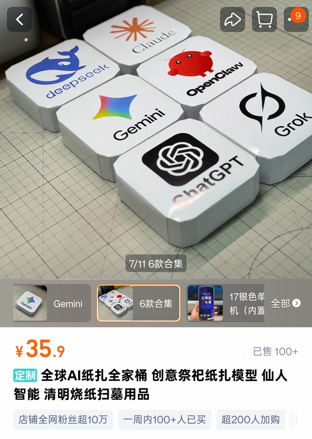 清明节期间,纸质祭品的需求量增加。电商平台上,有卖家推出“AI大模型纸领带”,引发网友热议。电商平台销售的人工智能造纸用品。 4月4日,时效新闻记者查看产品信息发现,所谓的“AI大模型造纸”是一家供应商以著名AI应用命名的工艺品,售价35.9元。此外,用户还可以定制其他创意纸质用品,例如智能手机、剃须刀、游戏机、麻将桌等。这些产品最近30天内的最高销量为300件或以上。不少消费者购买后评价:“这个很原创”。希望天上的家人珍惜它。”有网友也很好奇,相比于传统的造纸屋,为什么商家会做这种新型的造纸用品呢?一位纸制品生产商告诉记者:“其实,AI造纸模型是客户提出的一个要求。时代发展很快,大型AI模型正在融入日常生活,如果下层社会的人们不能体验的话,那就太难过了。我们也希望他们能享受到科技生活的便利。”据阿岳介绍,清明节期间推出了许多新的定制纸制品,销量比平时高出三到五倍。从年初开始,就有人开始预约。所有这些产品的纸袋都是手工制作的,所以这两天我们增加了产量和交货量。此外,一些客户必须做出牺牲。我们还将完成装订和刻录这些文件并制作视频的过程,以向用户提供反馈。一些新的造纸用品 关于造纸用品的变化,民俗专家桑杰联合国相信,这些新型造纸用品正在将人类世界的科技和温暖传送到彼岸。它们不仅传达了思念、安慰和友情,也减轻了追悼会的重量,让追悼会以一种轻松的方式变得更加亲密。桑俊先生表示,清明节历经千年,瞻望终局,追求未来,总欲在生死中开始。过去,一团纸最多的是钞票、房屋、车马。他表达了对后人祖先的敬仰和关怀。如今,牺牲品正在随着时代而变化,从家电、汽车和智能手机到今年流行的人工智能和智能机器人模型。各种疫病祭祀,都反映了当下的生活。形式虽新,但意旨不变,传统民俗自然而然地传承到了现代。此更改掩盖了更多 b中国人民对生死的深刻认识。年轻一代自愿参与,复兴古风,不仅软化了思想,也凝聚了文化认同。 (吉姆新闻记者 陈阳阳)