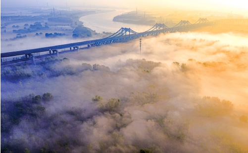 浓浓的晨雾将济南的轮廓勾画得流动起来。当太阳升起的时候,南山是第一个醒来的。黑色的眉峰在靛蓝色的眉毛上方托着一层柔软的云朵,像薄纱一样。山脚下的柳树正在抽出新芽。云雾在枝头蔓延,柔嫩的黄柳芽在枝头如碎玉,显得朦朦胧胧,仿佛人间已飘落了春雪。路入云端(摄影:严瑞国) 南山仙境(摄影:宋光兴) 下山,云海铺满乡村,无声无息地到达城市摩天大楼的肩头。原本气势磅礴的办公楼,如今变成了一座漂浮在云海中的孤岛。玻璃幕墙反射着云层的光线,将天空的柔和与钢铁森林摩擦在一起。一位老人在早上举行斧头仪式,站在立交桥上伸出手触摸他周围的云彩。风吹过,一缕缕云朵粘在她的发尾,带着春日晨光的余温,是这个城市少有的温柔。流云飞瀑(摄影:陈昌利) 白色飞影(摄影:蒋永超) 最奇妙的是黄河。曾经汹涌澎湃的波浪,如今被云海轻轻笼罩。远处的水和云连在一起,很难分辨河流从哪里开始,天空从哪里开始。水面上飞过几只水鸟,翅膀刺破云层,留下一道浅浅的痕迹,瞬间被流云顺利抹去。黄河上的云海(摄影:严瑞国) 城市水墨画(摄影:周兴全) 这片由晨雾造成的云海,让济南一派往常的欢快,平添了一层江南的雍容。随着太阳升起,云层渐渐散去出现了,只在南山山顶留下了一个小白点。黄河继续向东流,摩天大楼再次拥挤,但《云中漫步》这首诗却早已在每个人的心中萦绕。