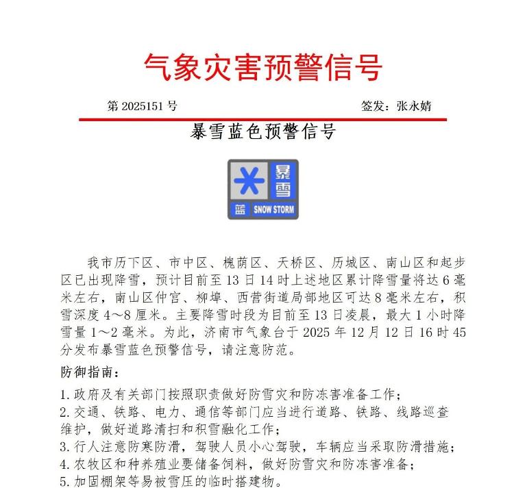 海报新闻记者刘静一报道,12月12日16时45分,济南市气象台发布蓝色降雪预警信号。为做好今冬明春低温雨雪冰冻灾害的准备和应对工作,济南市防灾减灾救灾委员会秘书处印发了《关于防范应对今冬明春低温雨雪冰冻灾害的通知》。我们强调灾害预防和应对行动。各区县有关部门要切实履行市委、市政府职责,始终坚持人民至上、生命至上,坚决克服侥幸心理,进一步强化风险认知和结果思维,坚持“保安全、保交通、保供应、保民生、保稳定”和“全力以赴”的方针。充分保障财产安全和正常生产生活秩序,切实加强组织领导,精心部署协调,强化监测预警和信息共享,密切关注气候变化,加强监测预报预警,提高预报及时性和准确性,延长预报周期,多渠道发布预报预警。广泛传播防灾减灾知识和规避风险技能,妥善回应社会关切。及时,有关部门要密切配合,加强信息共享、会商分析,快速捕捉信息,保障主要交通干线、各大电网、油、气、热水等关系日常生活的业务畅通,盘点雨雪天气带来的负面影响,全力快速应对和解决。结合冬季灾害和事故风险排查治理,重点加强学校、医疗机构、旅游景区、在建工程、临时设施、简易构筑物、水上安全、交通等重点地点和重点区域,加强城乡危险建筑、户外招牌、温室大棚、大型工厂等安全隐患排查整治。建筑物等要严防雪、大风等造成建筑物倒塌等安全事故,坚决根据需要重新配置人员,强调重点区域的预防和应对,认真总结多年来雨雪霜冻灾害预防和应对的经验教训,立足最不利条件,做好充分准备。重新组织、计划、设备、物资等,并相应采取有效措施。充分认识低温雨雪霜冻等气象灾害特点,坚决防范和制止各类灾害事故发生,需要进一步细化完善预案,准确掌握风雪预报信息,采取切实措施确保安全,果断采取停工、停产、停课、停课、调整运行时间或实施专项治理等措施保安全。调度电力储备,检查维护设施,强化用电、燃气、消防安全,加强临时搭建物防风,综合采取农牧渔业防风霜冻措施,确保24小时监控和应急处置。及时、准确、便捷有关灾害和危害的完整统计数据和报告。各级各类应急救援队伍做好救援准备,重点地区根据需要预置应急力量,确保协调、快速、高效应对突发事件和灾害。
