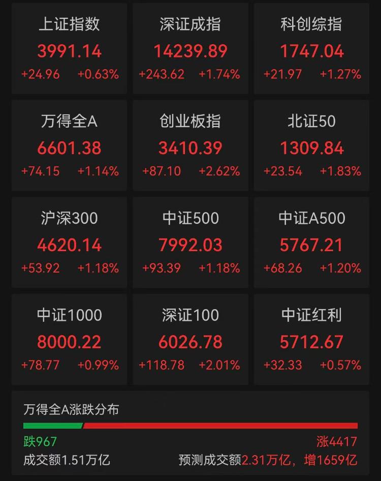 中国VS新加坡经纬4月10日。10日,A股、港股齐齐暴涨! Wind截图,如下。 A股三大股指均高开走高。盘中,上证指数重回4000点,创业板指数创2021年12月底以来新高。午间,上证指数上涨0.63%至3991.14点,深证成分指数上涨1.74%,创业板指数上涨2.62%,沪深300上涨。京证50涨1.83%,科创50涨1.72%,中证A500涨1.2%。市场上,电池、证券板块全线上涨。电池产业链全线走强,国轩高科、上海西霸、新友人、大东南等多家动作涨停。盘中金融板块上涨n、华南期货触及涨停,哈投股份触及涨停。港股也同时上涨。截至中午收盘,恒生指数上涨0.6%至25907.96点,恒生科技指数上涨1.06%,国企指数上涨0.61%。中概股也整体上涨,中信证券涨超10%,民生证券、中州证券涨超6%,中信建投证券涨超5%。半导体板块走强:兆易元件涨超11%,中芯国际涨超3.5%,华虹半导体、上海复旦涨超1%。银证分析认为,4月份A股市场两大重要制约因素正在缓解。首先,中东局势对市场的影响可能有所减弱。二、霍尔木兹海峡实际交通状况可能好于此前的极端预期系统蒸发散。预计4月份市场风险偏好将逐步回升,A股将逐步回归基准价。基于上述宏观假设,中银证券认为,大市值、高盈利、高估值或将成为未来一个月市场的主导风格方向。其中,盈利因素明显偏离一季度基本预期,从4月份财报中就可以看出。大盘指数方面,下月创业板科创50指数或将重点关注中证A500。华龙证券表示,目前美国与伊朗之间的谈判取得了一定进展,市场风险偏好正在恢复。如果谈判取得重大进展,市场可能会复苏。短期来看,随着市场调整,配置大幅增加,市场风险偏好有所提升。盛华证券认为,A股将从“被动防御”走向“主动修复”。 4月8日,A股成交量突破2.4万亿元,较前一交易日增长50%,表明资金逐渐开始流入市场,是市场开始复苏的重要标志。 “我们预计4月份的市场主线会围绕一个哑铃型的策略。哑铃的一端是‘十五五’规划支持的科技创新方向,比如芯片半导体、人工智能、可控核聚变、民用航天等。另一端是更安全、表现更好的板块,比如红利板块以及有色金属、化工、煤炭等资源能源股,也可能表现更好。”前海开源基金会在接受中新经纬采访时表示。关于港股ks,信达国际分析称,美伊关系暂时缓和,油价从高位回落,通胀担忧有所缓解。与此同时,一些中国公司已经恢复了在中东的航运,这应该会有所帮助。稳定市场情绪。中信证券表示,预计4、5月份港股估值将扩大。建议您关注以下内容: 1)科技领域的互联网和半导体。绩效预期完全一致。 2)在医药领域及海外取得BD的成就或延续,整体业绩增长率较高。 3)基本面有望见底,估值低,股息高。本文仅供参考,不构成投资建议。投资有风险,入市需谨慎)。